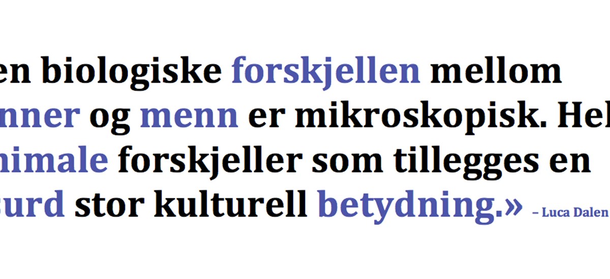 Vi snakker med letthet om kvinner og menn som vesensforskjellige grupper. Hadde vi snakket sånn om svarte og hvite mennesker hadde jo folk steilet. Vi har omsider klart å ta innover oss at det ikke er vesentlige biologiske forskjeller mellom de såkalte menneskerasene, men når det kommer til kjønnene, stopper det opp.