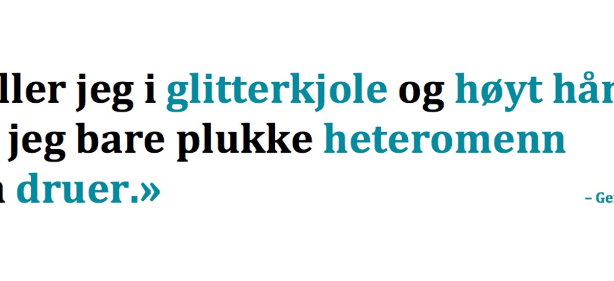 Jeg går aldri ut i dameklær etter forestilling lenger. Når du spiller papegøye på nasjonalteateret, går du jo ikke ut som papegøye på byen etterpå! Men jeg har vært mye på byen i drag og jeg vet jo at stiller jeg i glitterkjole og høyt hår så kan jeg bare plukke heteromenn som druer. Det tror jeg handler om at når de ser så lekre bein, så høyt hår og så mye glitter og stas, så assosieres det på en måte med porno for dem. Det er en litt sånn pavlovsk reaksjon, sikkelet kommer med en gang, hahaha. Geir setter opp et ansikt som en tørst St. Bernard.
