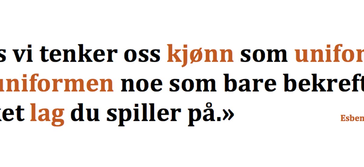 Hvis vi tenker oss kjønn som uniform så blir uniformen noe som bare bekreft er hvilket lag du spiller på. Men uniformen i seg selv er død, den må gis en kulturell betydning og dermed et bekreftelsespotensial for å bli levende.